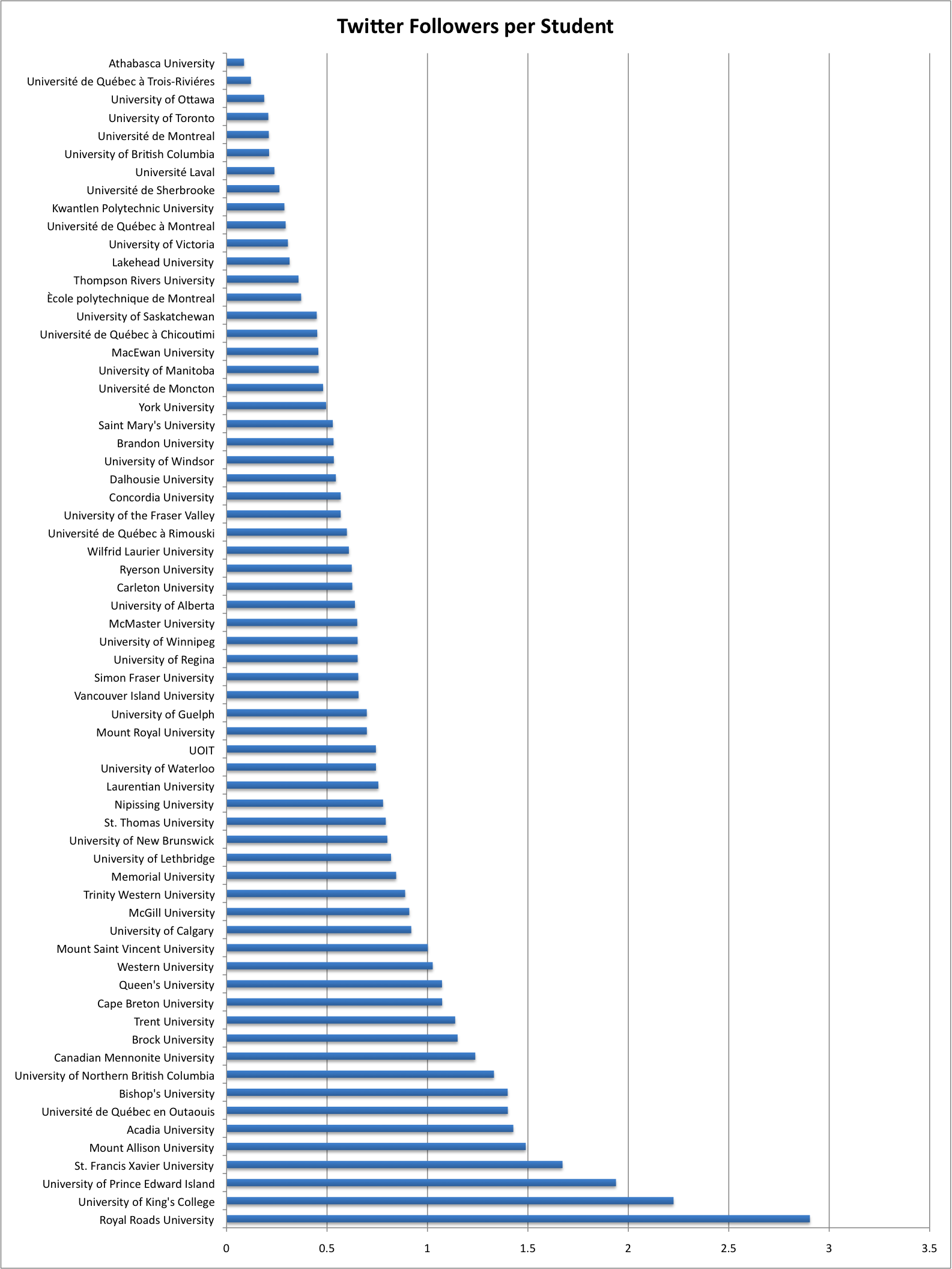 Despite these successes, having a large enrollment meant low rates of followers per student for most of Canada’s large universities.